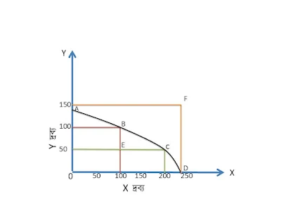 হয় যা A বিন্দুতে দেখানো হয়েছে। এখন Y দ্রব্যের উৎপাদন যথাক্রমে 100, 50, 0 একক হলে X দ্রব্যের উৎপাদন হবে যথাক্রমে